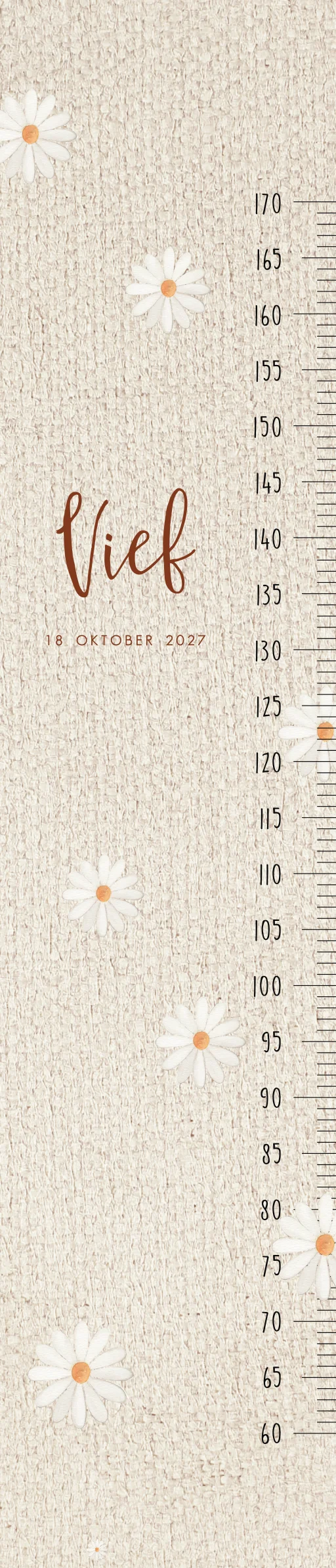 Groeimeter met linnen look achtergrond en madeliefjes.