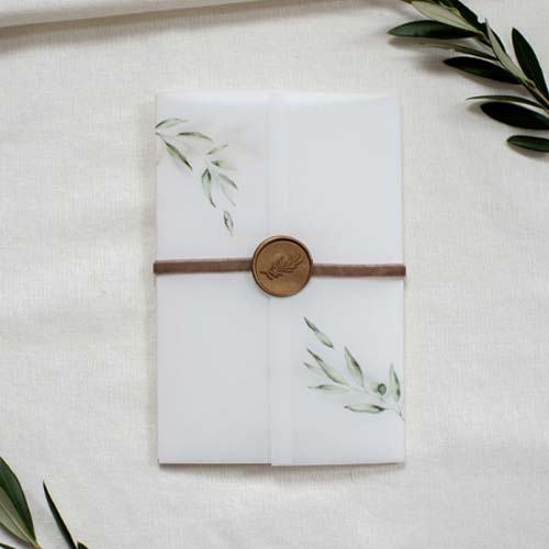Verpak jouw trouwkaart op een mooie manier met deze omslag van kalkpapier. Het doorzichtige melkpapier geeft een unieke en romantische touch. Deze omslag is voorzien van Mediterraanse olijftakjes.“Wij zijn heel tevreden met de service van Studio Dijs. We waren op zoek naar een iets bijzonderder kaartje, en bij Studio Dijs vonden we precies wat we zochten. Zowel de proefdruk als de daadwerkelijke geboortekaartjes waren snel geleverd.”