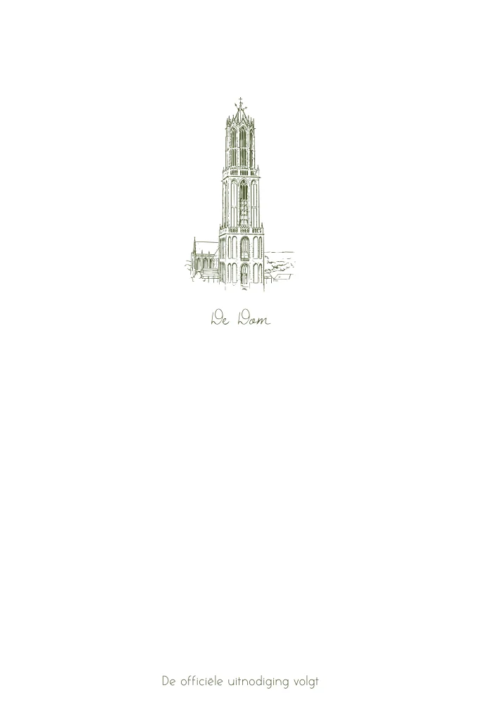 Hippe Save the Date kaart met lijntekening van De Dom in Utrecht, gedrukt op doorzichtig kalkpapier. Een deel van de tekst is voorzien van goudfolie.