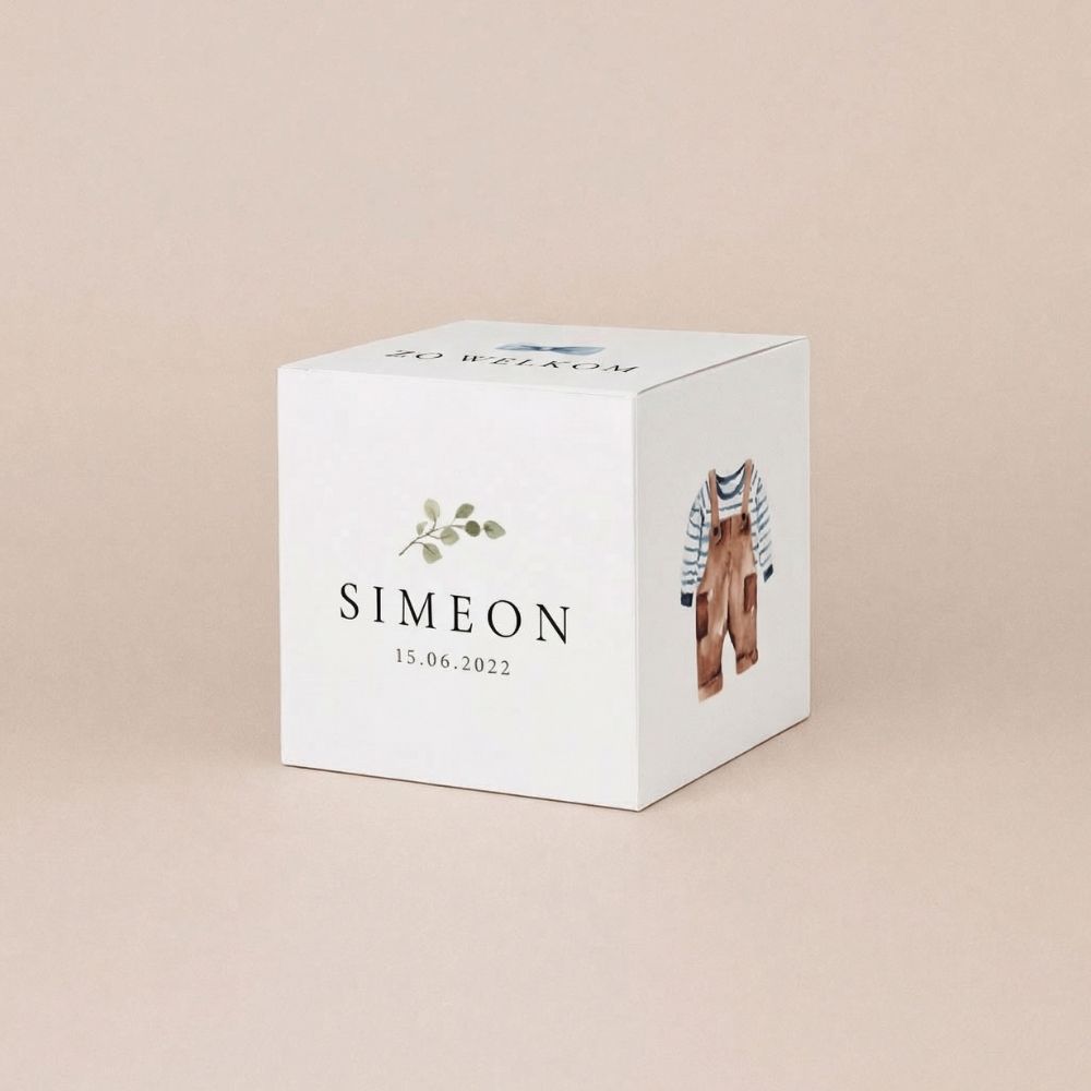 Met dit kubusdoosje maak je van je doopsuikers een echt cadeautje. Ontwerp het doosje in de stijl van je geboortekaartje en geef familie en vrienden een persoonlijk bedankje mee. De doosjes worden plat geleverd en zijn eenvoudig zelf te vouwen. Handig en leuk om alvast te doen tijdens je verlof.