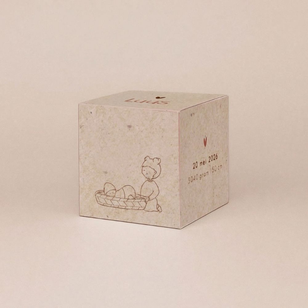 Met dit kubusdoosje maak je van je doopsuikers een echt cadeautje. Ontwerp het doosje in de stijl van je geboortekaartje en geef familie en vrienden een persoonlijk bedankje mee. De doosjes worden plat geleverd en zijn eenvoudig zelf te vouwen. Handig en leuk om alvast te doen tijdens je verlof.