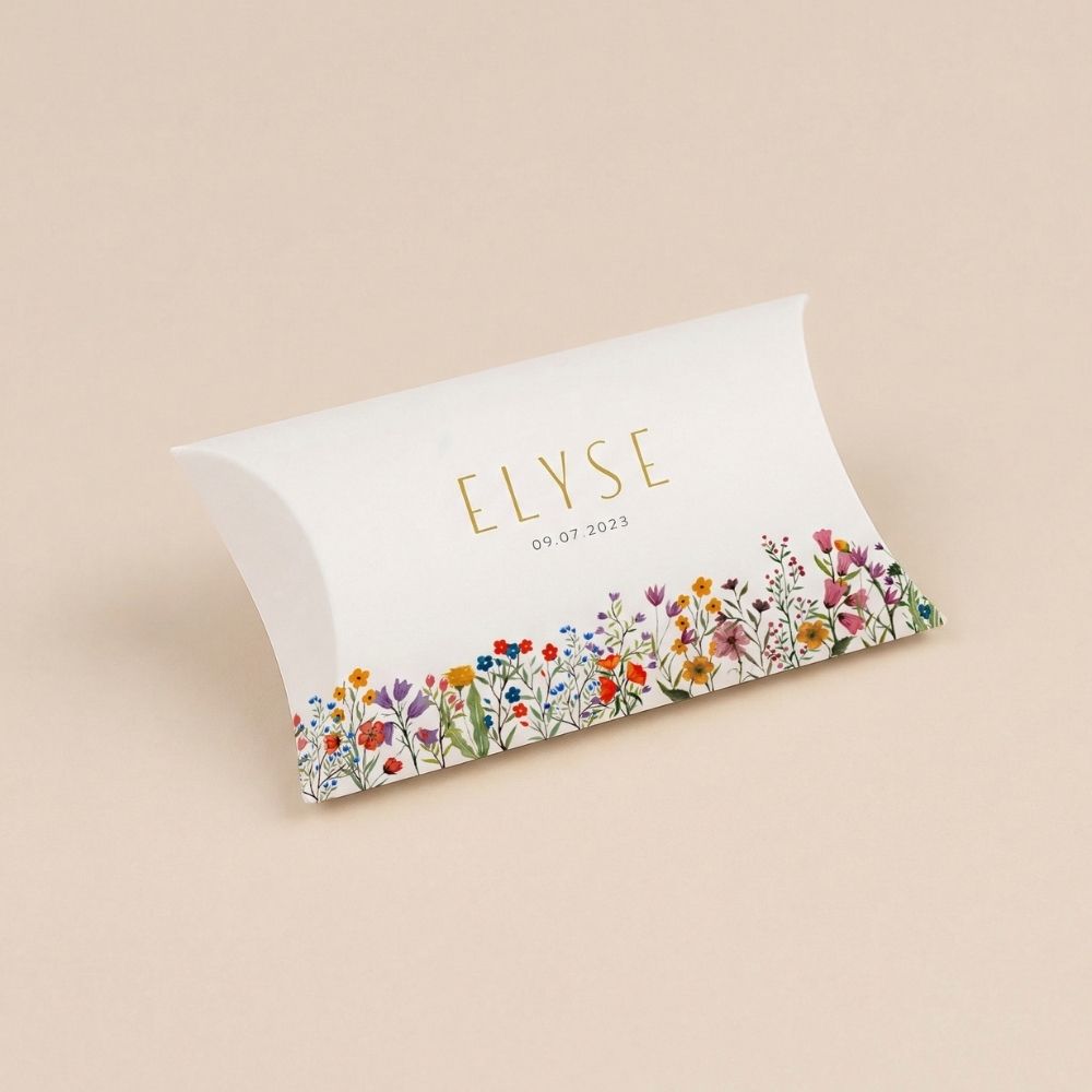 Hoe leuk is dit gondeldoosje in de stijl van jullie geboortekaartje! Met gekleurde bloemetjes.
