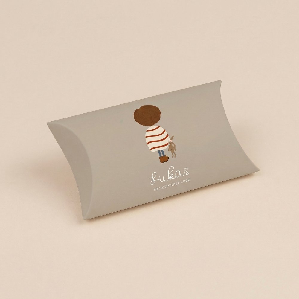 Hoe leuk is dit gondeldoosje in de stijl van jullie geboortekaartje! Met jongetje met knuffeltje.