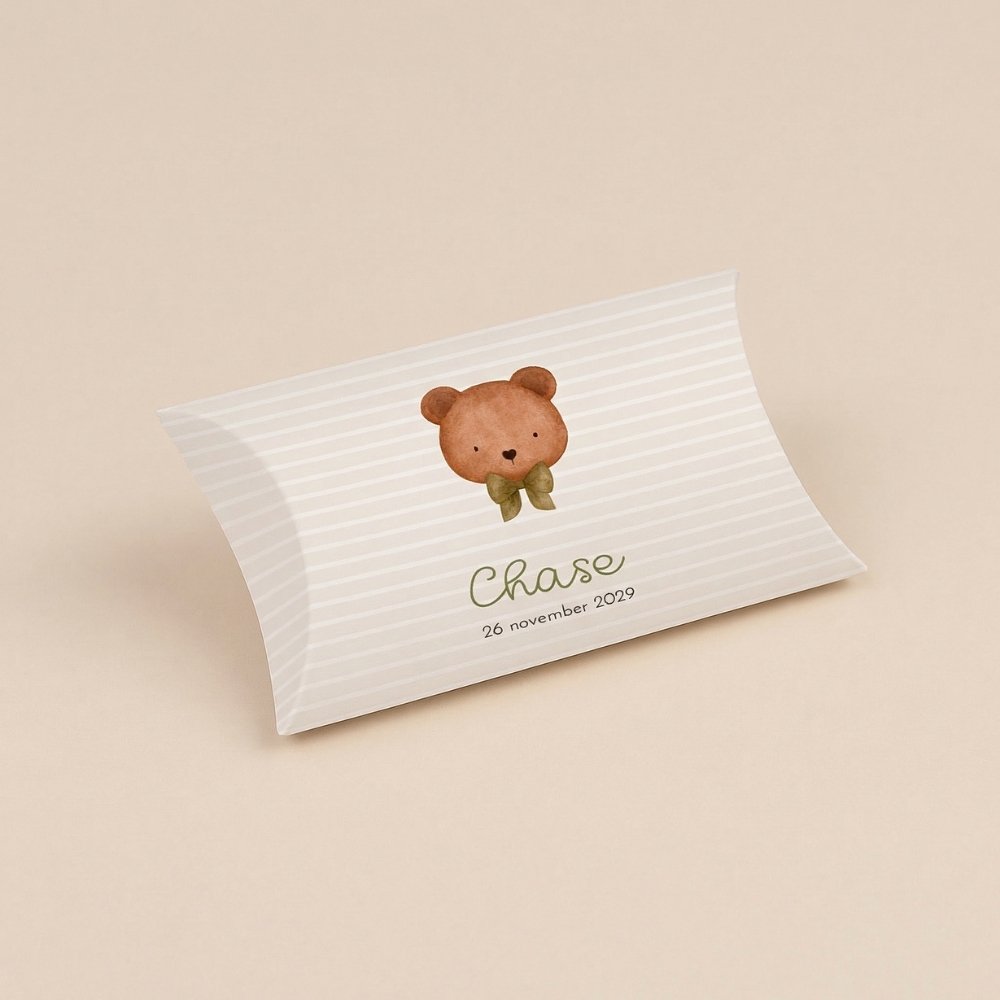 Hoe leuk is dit gondeldoosje in de stijl van jullie geboortekaartje! Deze voor een jongetje met een schattig beertje.