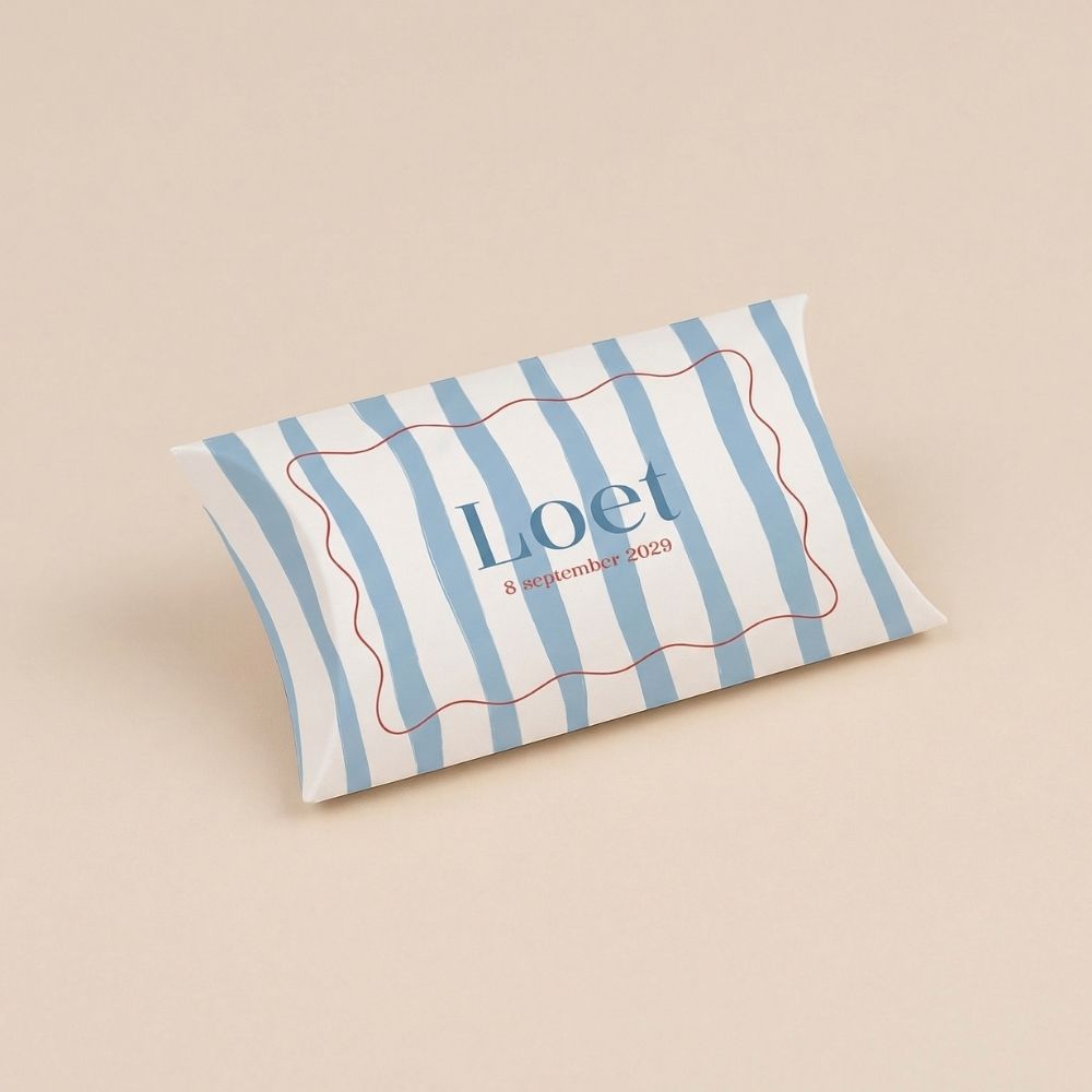 Hoe leuk is dit gondeldoosje in de stijl van jullie geboortekaartje! Met gestreept design en (licht)blauwe en rode kleuren.