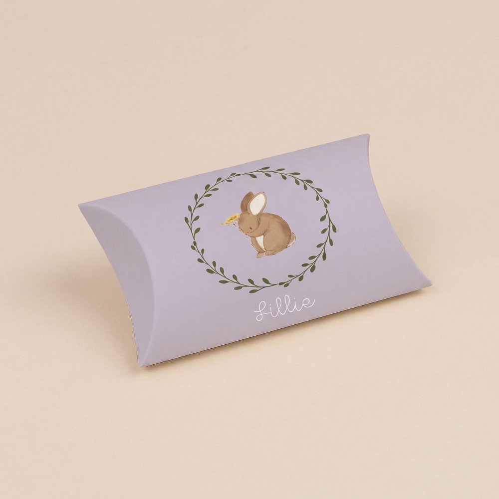 Hoe leuk is dit gondeldoosje in de stijl van jullie geboortekaartje! Met lief konijntje in paarse kleur.
