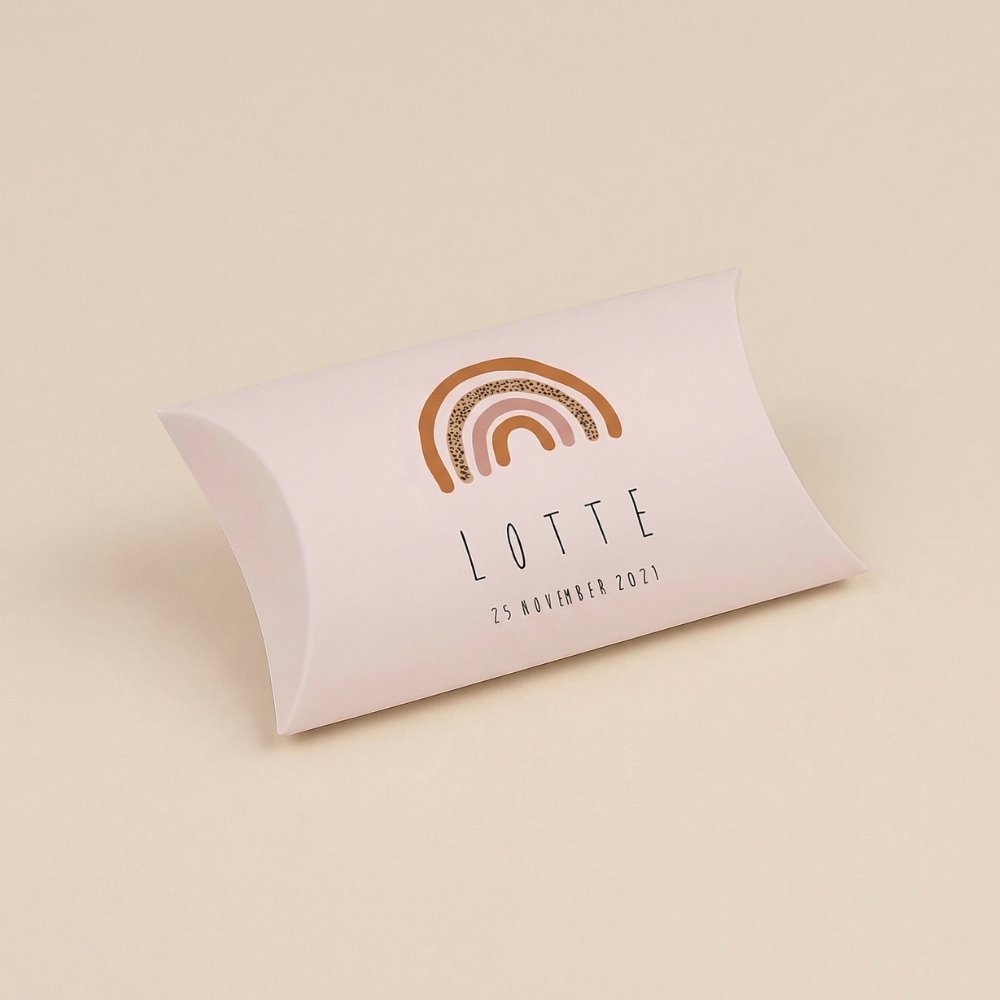 Hoe leuk is dit gondeldoosje in de stijl van jullie geboortekaartje! Met illustratie van een regenboog.
