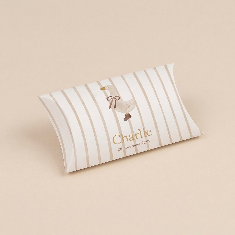 Hoe leuk is dit gondeldoosje in de stijl van jullie geboortekaartje! Met gestreepte achtergrond en schattige gans met strik.