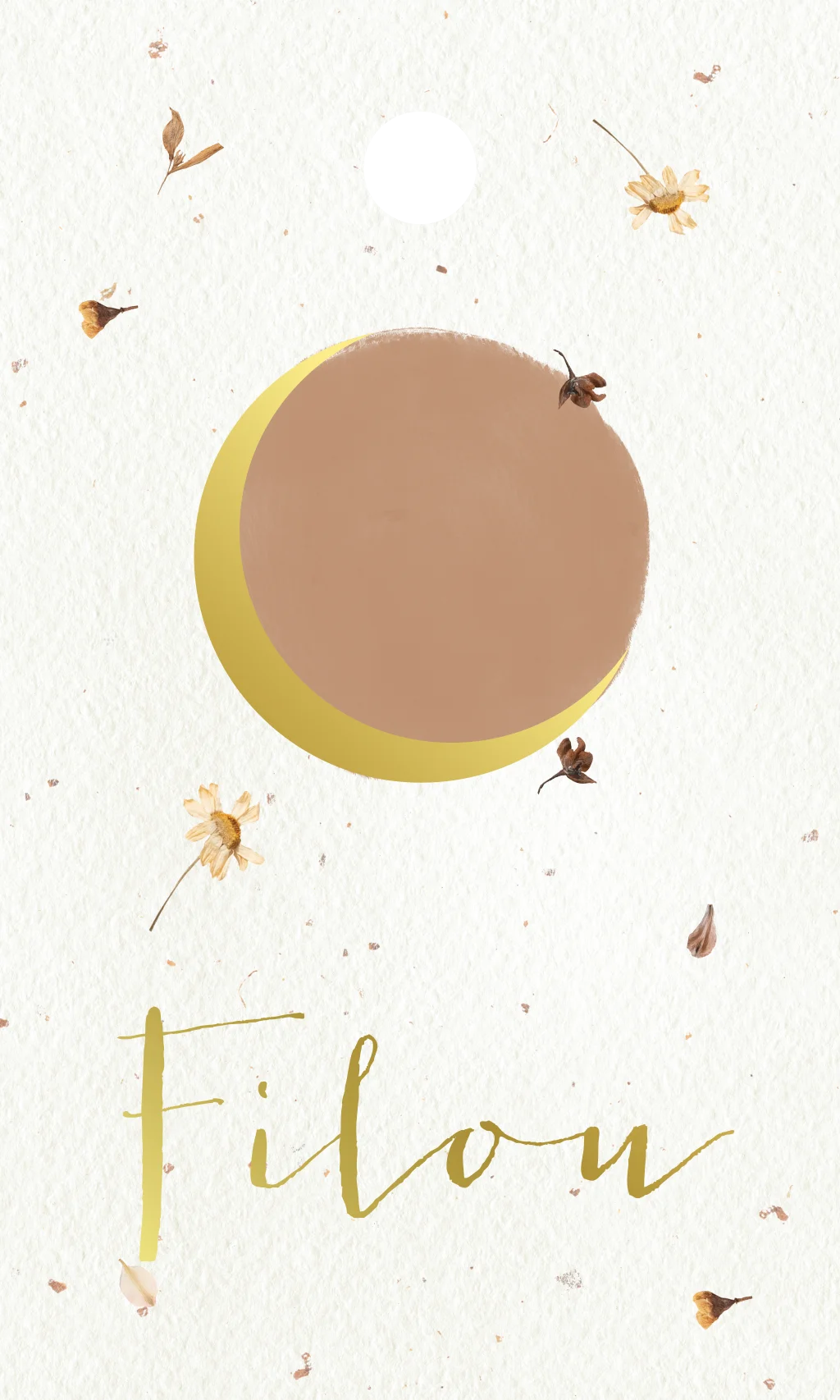Doopsuiker label in rechthoekige vorm voor de geboorte van een meisje. Met zon, maan en droogbloemen. Naam en maan in (goud)folie.