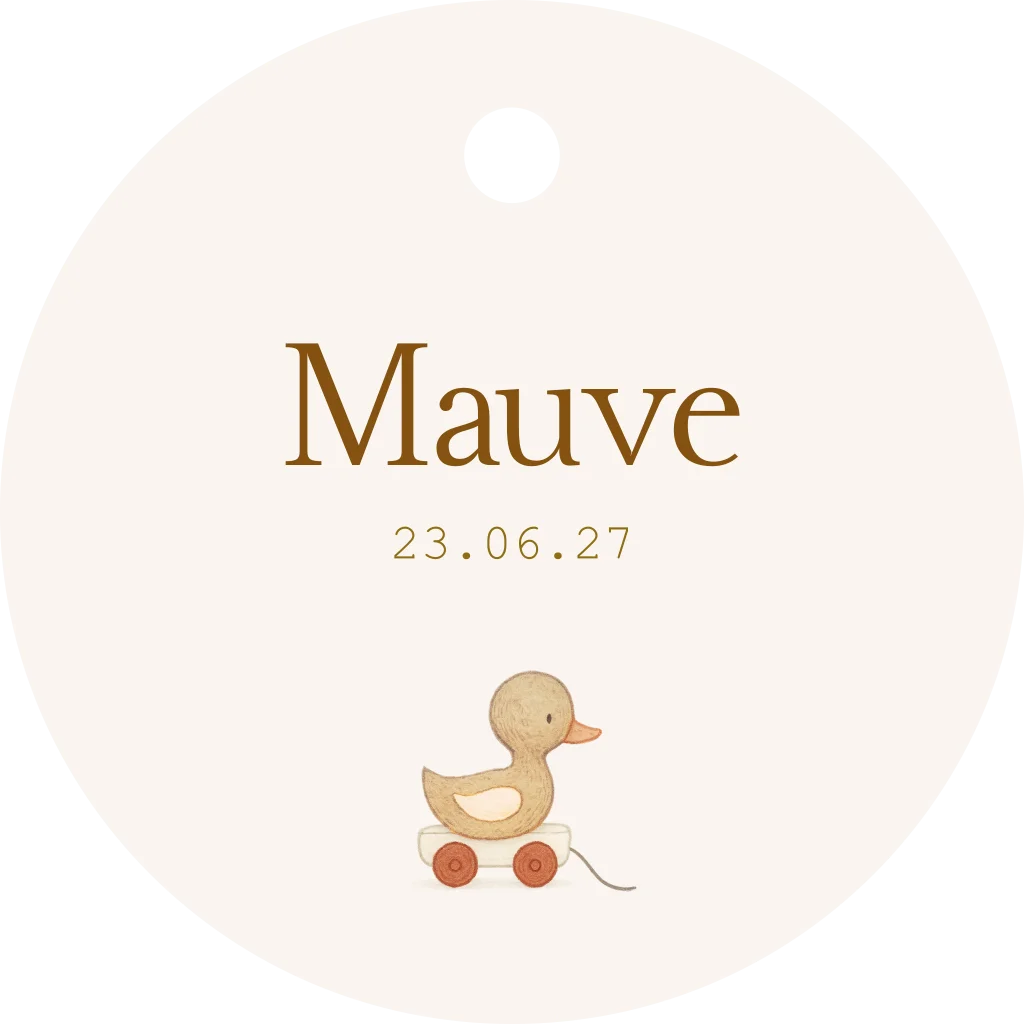 Doopsuiker rond label met een lief speelgoed eendjel.