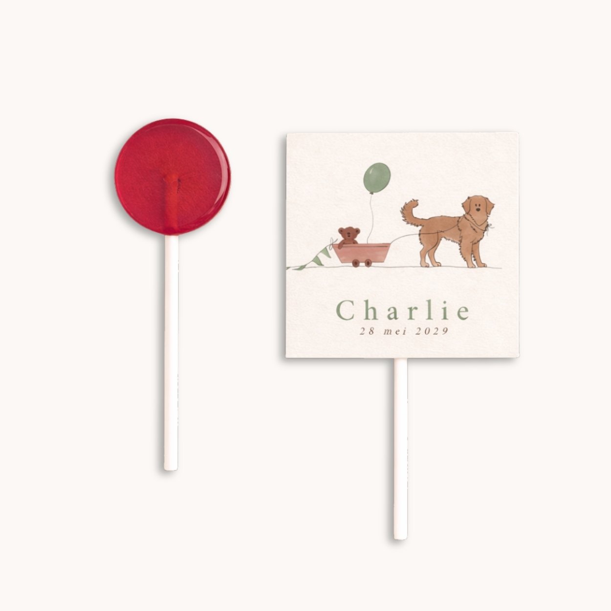Vier een bijzonder moment met dit lieve lollyhoesje met golden retriever en bolderkar! Heb je een ander huisdier? We maken graag een illustratie op maat. Mail ons voor alle mogelijkheden! Dit lollyhoesje is ideaal om te gebruiken als doopsuiker of als schattige traktatie. Personaliseer het ontwerp naar jouw smaak en maak er iets unieks van voor jullie kleine spruit.