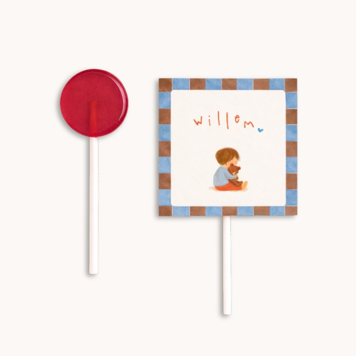 Vier een bijzonder moment met dit lieve lollyhoesje met illustratie van een jongetje met knuffelbeertje! Ideaal om te gebruiken als doopsuiker of als schattige traktatie. Personaliseer het ontwerp naar jouw smaak en maak er iets unieks van voor jullie zoon.