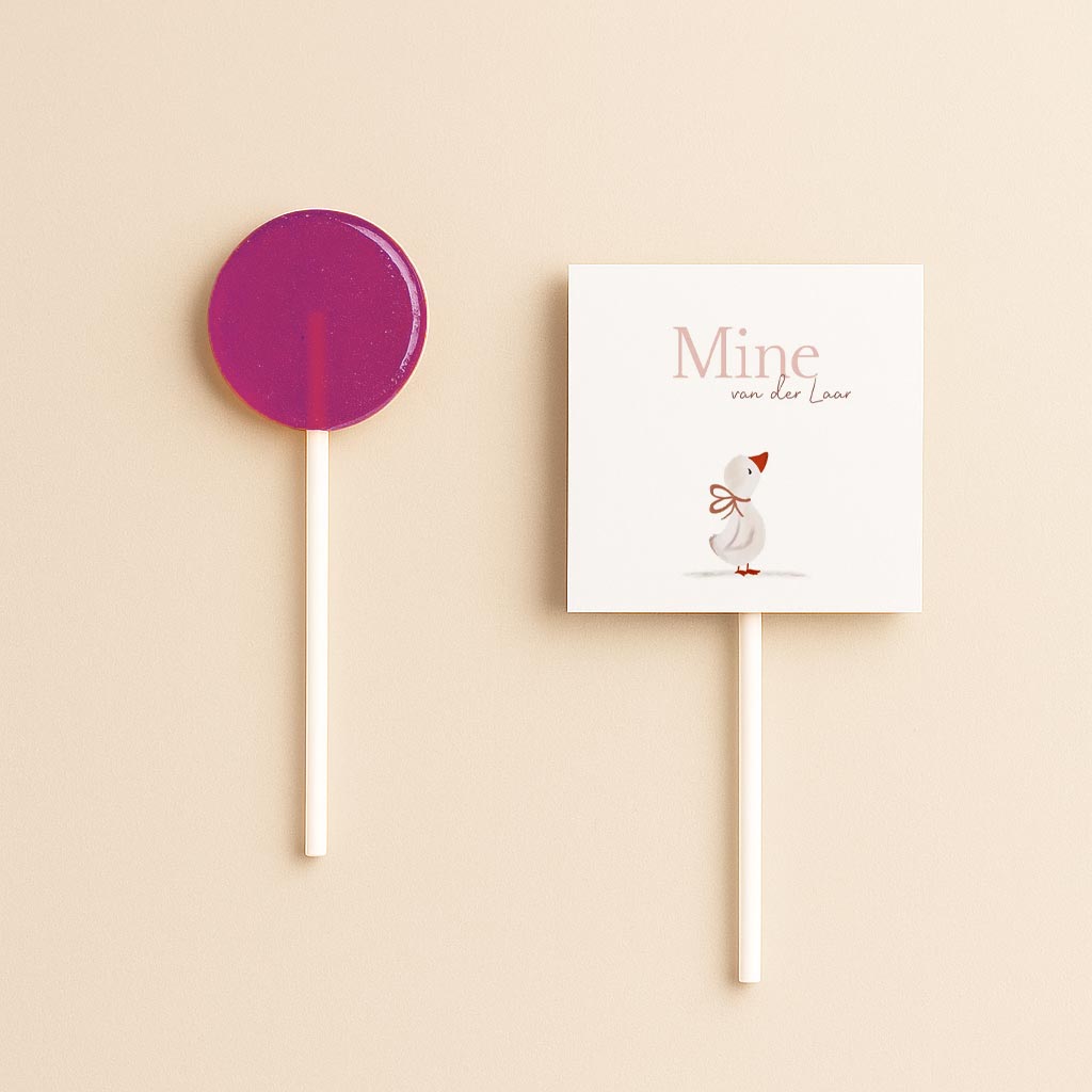 Vier een bijzonder moment met dit lieve lollyhoesje met lief klein kuikentje! Ideaal om te gebruiken als doopsuiker of als schattige traktatie. Personaliseer het ontwerp naar jouw smaak en maak er iets unieks van voor jullie dochter.