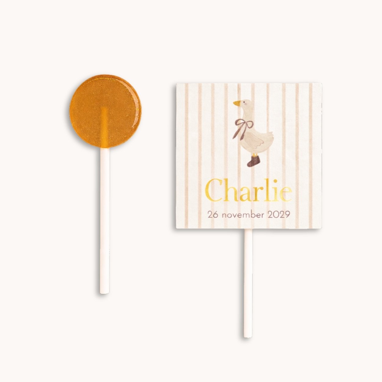 Vier een bijzonder moment met dit lieve lollyhoesje met een gansje met strik! Ideaal om te gebruiken als doopsuiker of als schattige traktatie. Personaliseer het ontwerp naar jouw smaak en maak er iets unieks van voor jullie kleine.