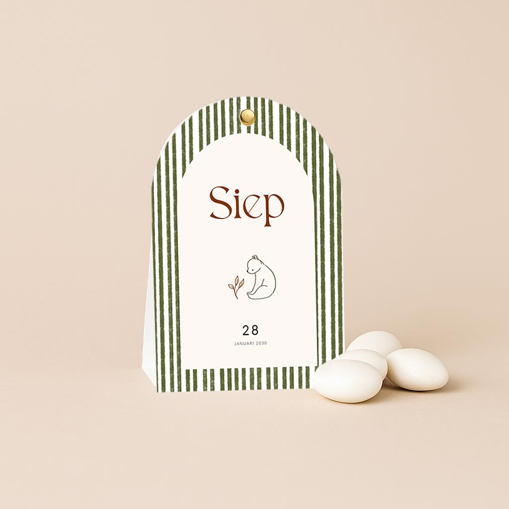 Geef je doopsuikers een persoonlijke touch met een uniek snoepzakje! Personaliseer de buitenzijde, bestel de bijpassende zakjes en splitpennen meteen mee en stel zo een compleet en feestelijk geheel samen. Voeg alleen nog je favoriete snoepjes toe en zet het zakje eenvoudig zelf in elkaar.
