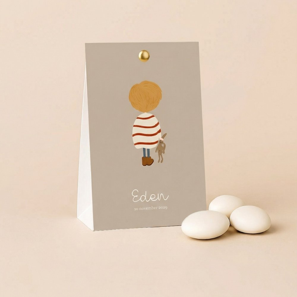 Doopsuiker snoepverpakking voor jongetje met illustratie van een jongetje en knuffelbeertje in zijn hand.