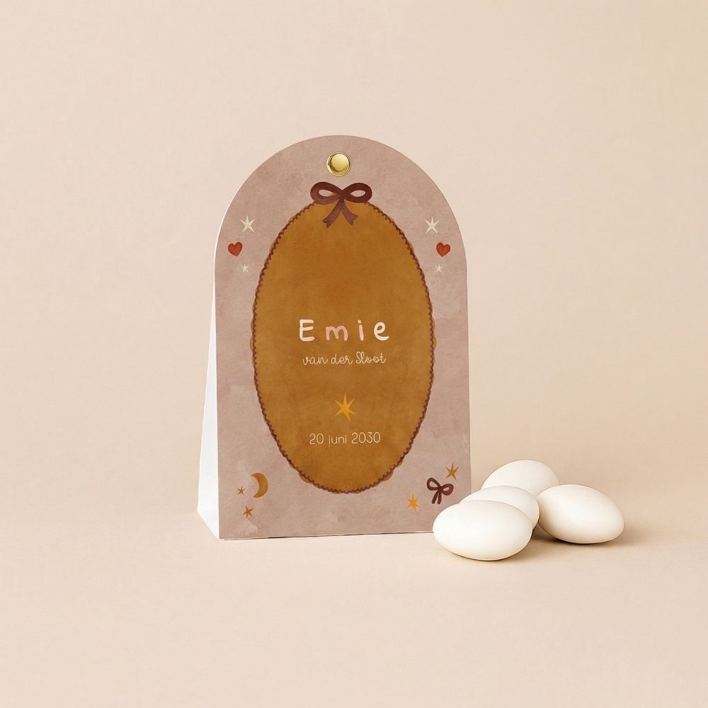 Geef je doopsuikers een persoonlijke touch met een uniek snoepzakje! Personaliseer de buitenzijde, bestel de bijpassende zakjes en splitpennen meteen mee en stel zo een compleet en feestelijk geheel samen. Voeg alleen nog je favoriete snoepjes toe en zet het zakje eenvoudig zelf in elkaar.