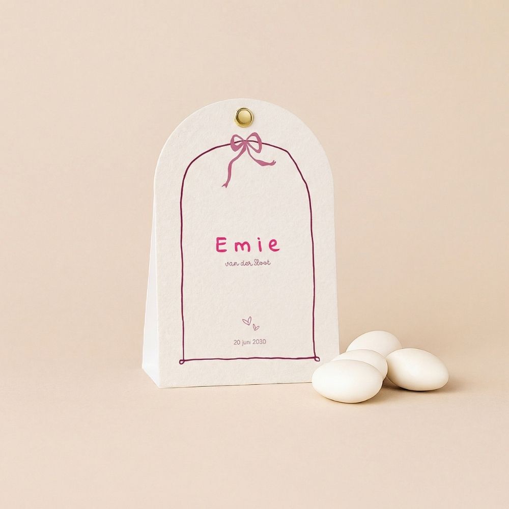Doopsuiker snoepverpakking voor een meisje in boogvorm, roze kleuren en een strikje.