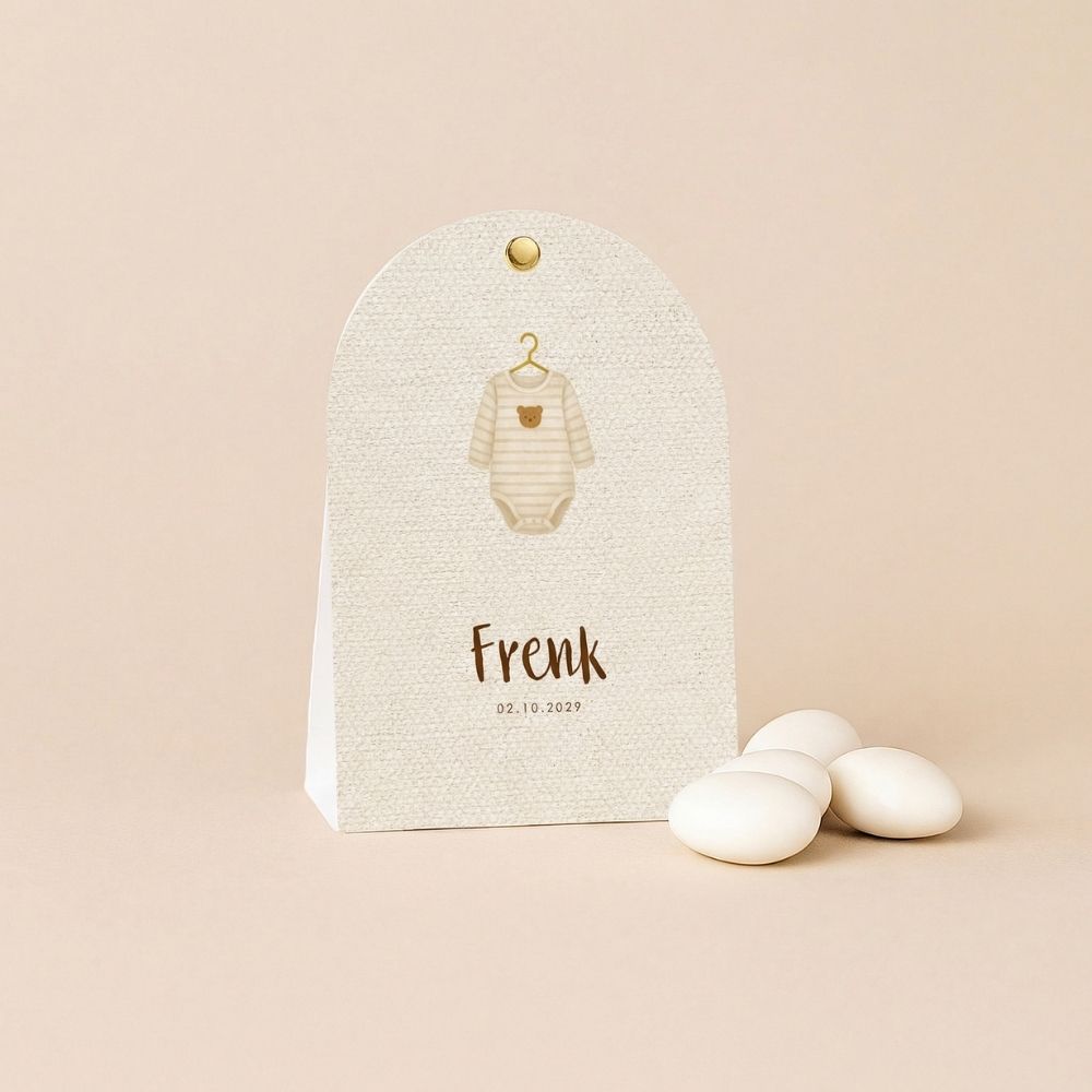 Doopsuiker snoepverpakking voor een jongetje met rompertje en linnen look achtergrond.