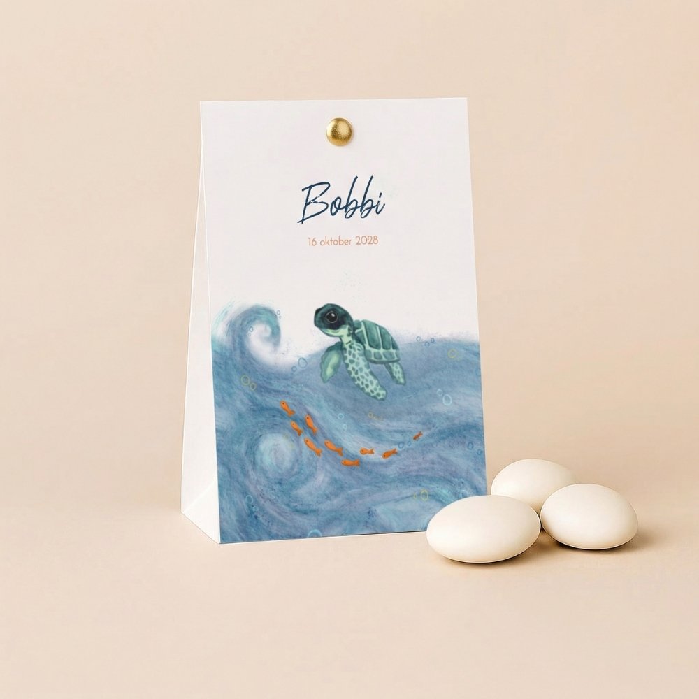Doopsuiker snoepverpakking voor jullie kleintje met zee-thema en illustratie van schildpadje en visjes.