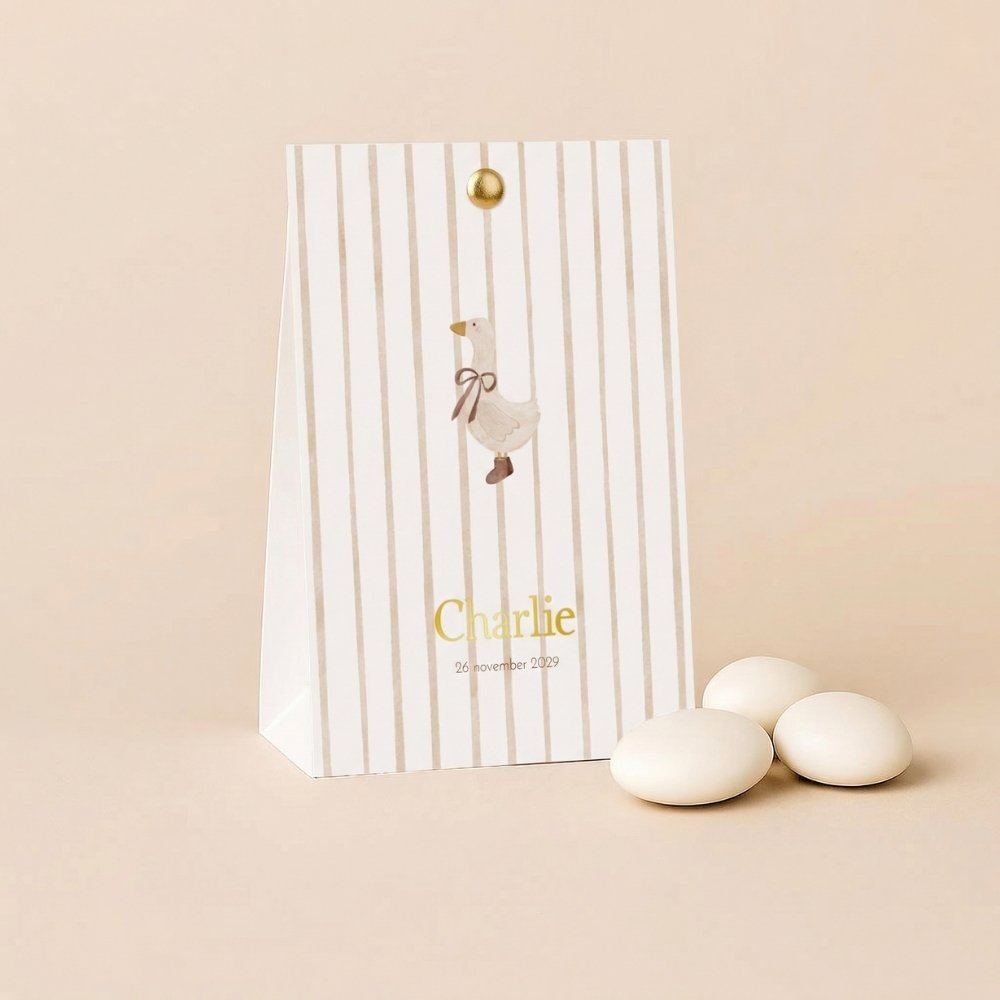 Doopsuiker snoepverpakking voor jullie kleintje met illustratie van gansje met strik.