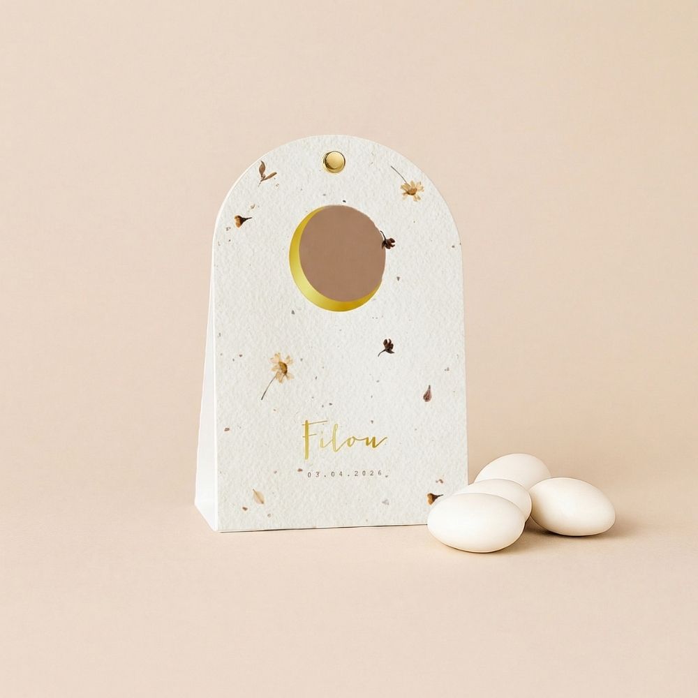 Doopsuiker snoepverpakking voor een meisje met droogbloemen, zon en maan op gevlekte achtergrond.