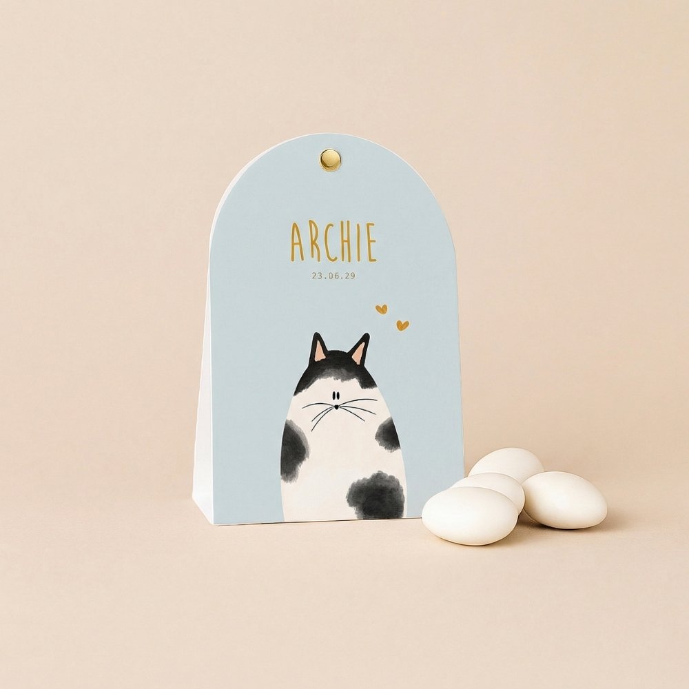 Doopsuiker snoepverpakking voor een jongetje met grappige illustratie van zwart-witte kat.