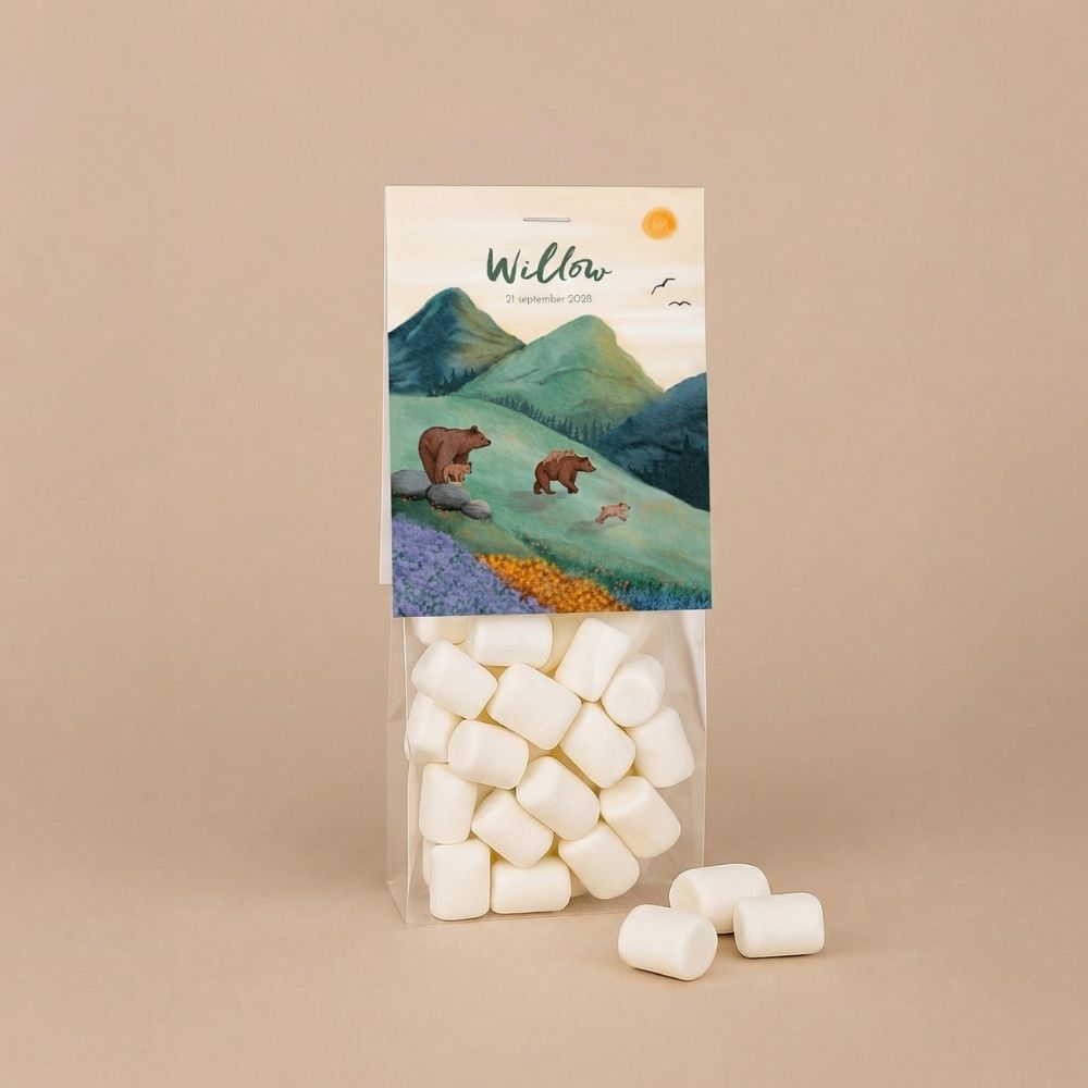 Dit vouwkaartje met lieve berenfamilie maakt van jouw doopsuikers een echt cadeautje. Bedank vrienden en familie in de stijl van je geboortekaartje voor alle lieve wensen en attenties. Bestel de transparante zakjes direct mee, zodat je het bedankje compleet kunt maken. Vul ze met snoepjes of doopsuikertjes, niet het kaartje vast en je hebt een prachtig geboortebedankje. Een heerlijk klusje om tijdens je verlof alvast te doen!