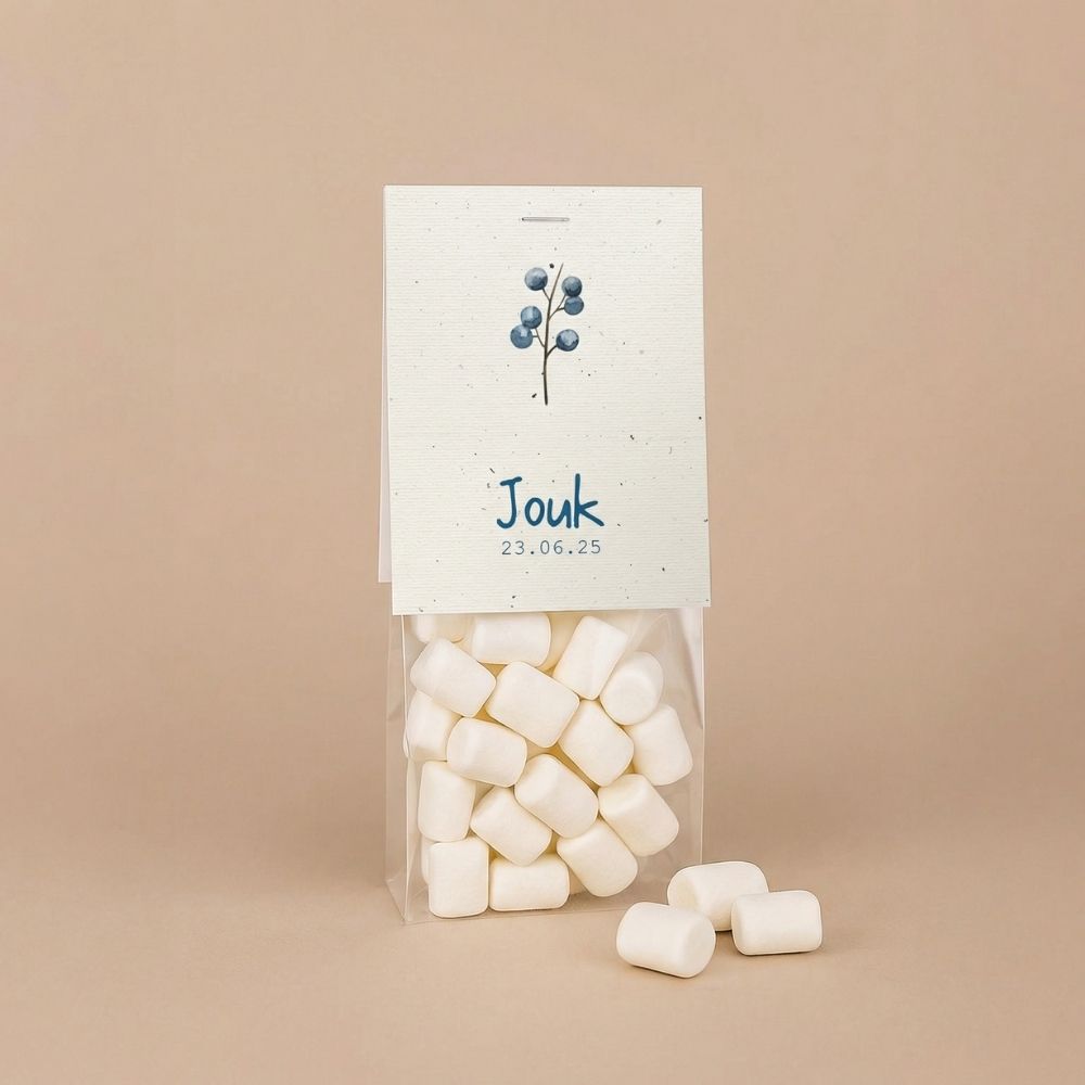 Dit vouwkaartje met blauwe besjes maakt van jouw doopsuikers een echt cadeautje. Bedank vrienden en familie in de stijl van je geboortekaartje voor alle lieve wensen en attenties. Bestel de transparante zakjes direct mee, zodat je het bedankje compleet kunt maken. Vul ze met snoepjes of doopsuikertjes, niet het kaartje vast en je hebt een prachtig geboortebedankje. Een heerlijk klusje om tijdens je verlof alvast te doen!