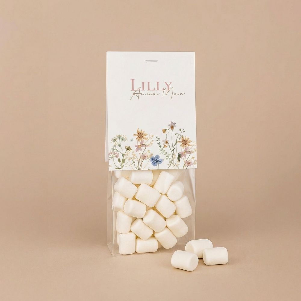 Dit vouwkaartje met bloemenveld maakt van jouw doopsuikers een echt cadeautje. Bedank vrienden en familie in de stijl van je geboortekaartje voor alle lieve wensen en attenties. Bestel de transparante zakjes direct mee, zodat je het bedankje compleet kunt maken. Vul ze met snoepjes of doopsuikertjes, niet het kaartje vast en je hebt een prachtig geboortebedankje. Een heerlijk klusje om tijdens je verlof alvast te doen!