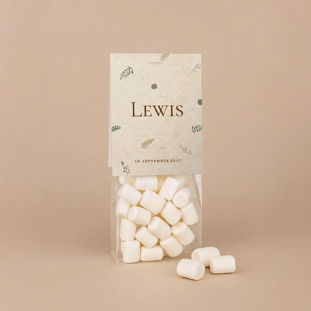 Dit vouwkaartje met eco look maakt van jouw doopsuikers een echt cadeautje. Bedank vrienden en familie in de stijl van je geboortekaartje voor alle lieve wensen en attenties. Bestel de transparante zakjes direct mee, zodat je het bedankje compleet kunt maken. Vul ze met snoepjes of doopsuikertjes, niet het kaartje vast en je hebt een prachtig geboortebedankje. Een heerlijk klusje om tijdens je verlof alvast te doen!