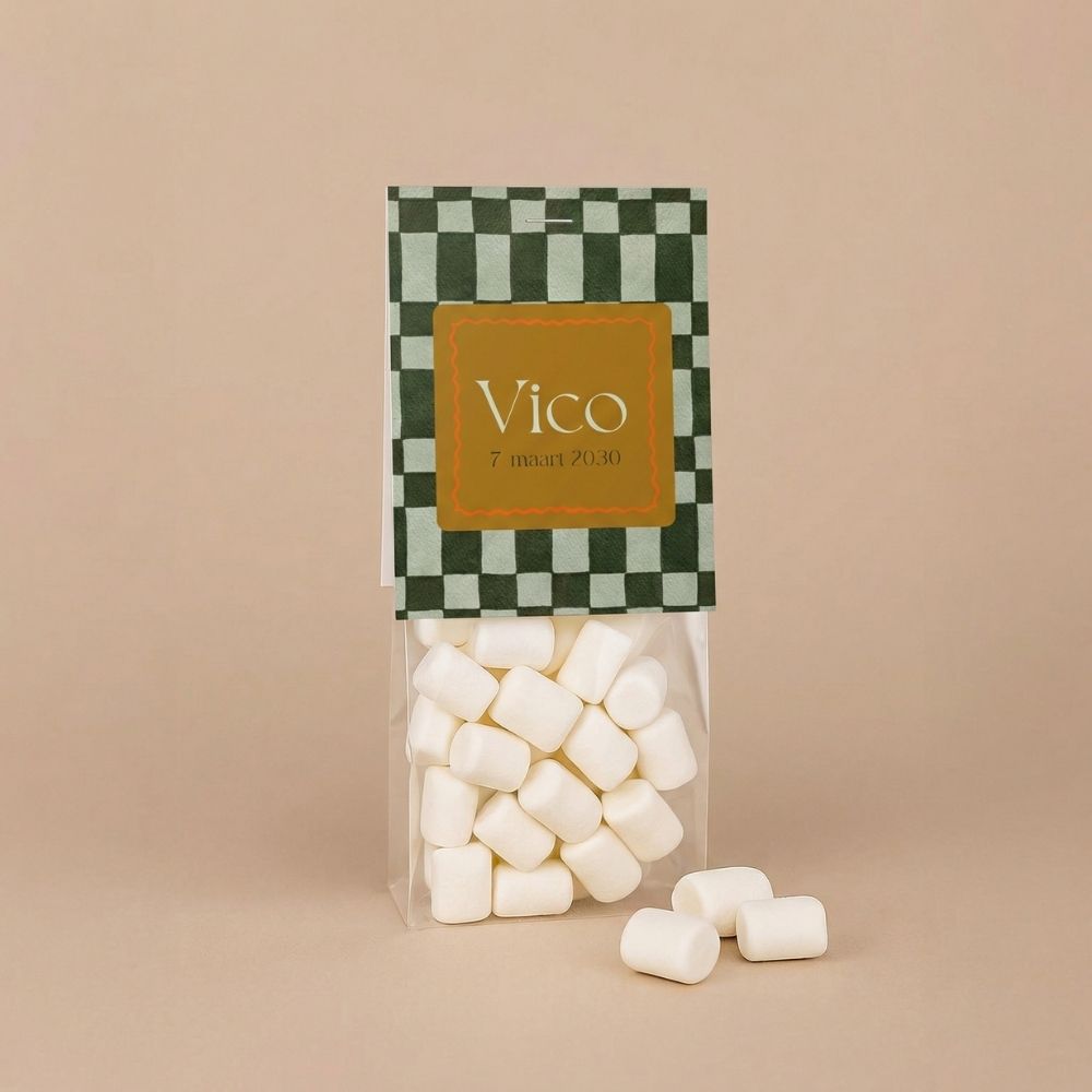 Dit vouwkaartje met geblokt design maakt van jouw doopsuikers een echt cadeautje. Bedank vrienden en familie in de stijl van je geboortekaartje voor alle lieve wensen en attenties. Bestel de transparante zakjes direct mee, zodat je het bedankje compleet kunt maken. Vul ze met snoepjes of doopsuikertjes, niet het kaartje vast en je hebt een prachtig geboortebedankje. Een heerlijk klusje om tijdens je verlof alvast te doen!