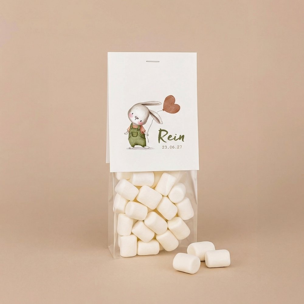 Dit vouwkaartje met konijntje en ballon maakt van jouw doopsuikers een echt cadeautje. Bedank vrienden en familie in de stijl van je geboortekaartje voor alle lieve wensen en attenties. Bestel de transparante zakjes direct mee, zodat je het bedankje compleet kunt maken. Vul ze met snoepjes of doopsuikertjes, niet het kaartje vast en je hebt een prachtig geboortebedankje. Een heerlijk klusje om tijdens je verlof alvast te doen!