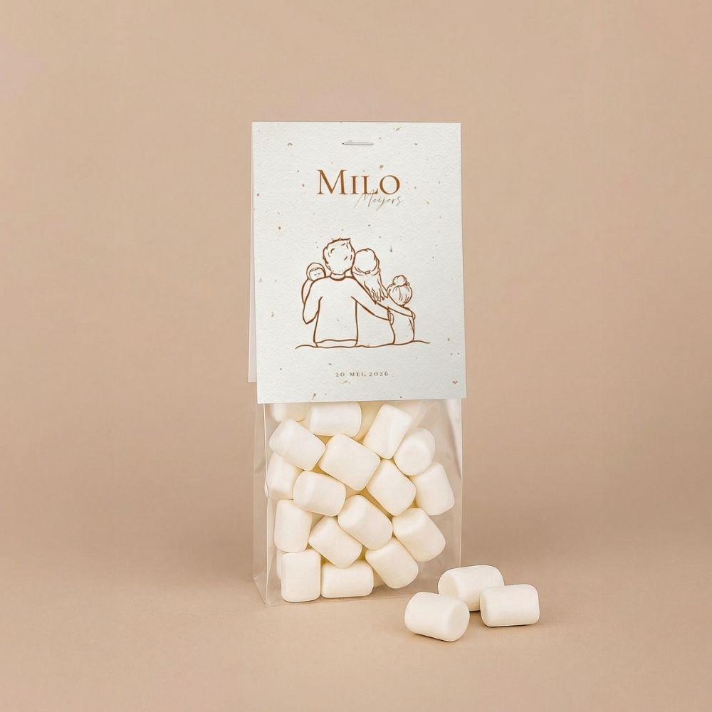Dit vouwkaartje met lijntekening van jouw eigen gezin maakt van jouw doopsuikers een echt cadeautje. Bedank vrienden en familie in de stijl van je geboortekaartje voor alle lieve wensen en attenties. Bestel de transparante zakjes direct mee, zodat je het bedankje compleet kunt maken. Vul ze met snoepjes of doopsuikertjes, niet het kaartje vast en je hebt een prachtig geboortebedankje. Een heerlijk klusje om tijdens je verlof alvast te doen!