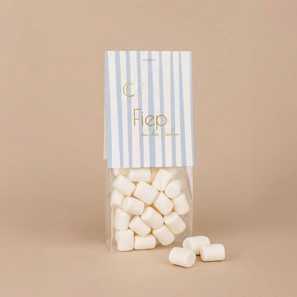 Dit vouwkaartje met maan en sterren maakt van jouw doopsuikers een echt cadeautje. Bedank vrienden en familie in de stijl van je geboortekaartje voor alle lieve wensen en attenties. Bestel de transparante zakjes direct mee, zodat je het bedankje compleet kunt maken. Vul ze met snoepjes of doopsuikertjes, niet het kaartje vast en je hebt een prachtig geboortebedankje. Een heerlijk klusje om tijdens je verlof alvast te doen!