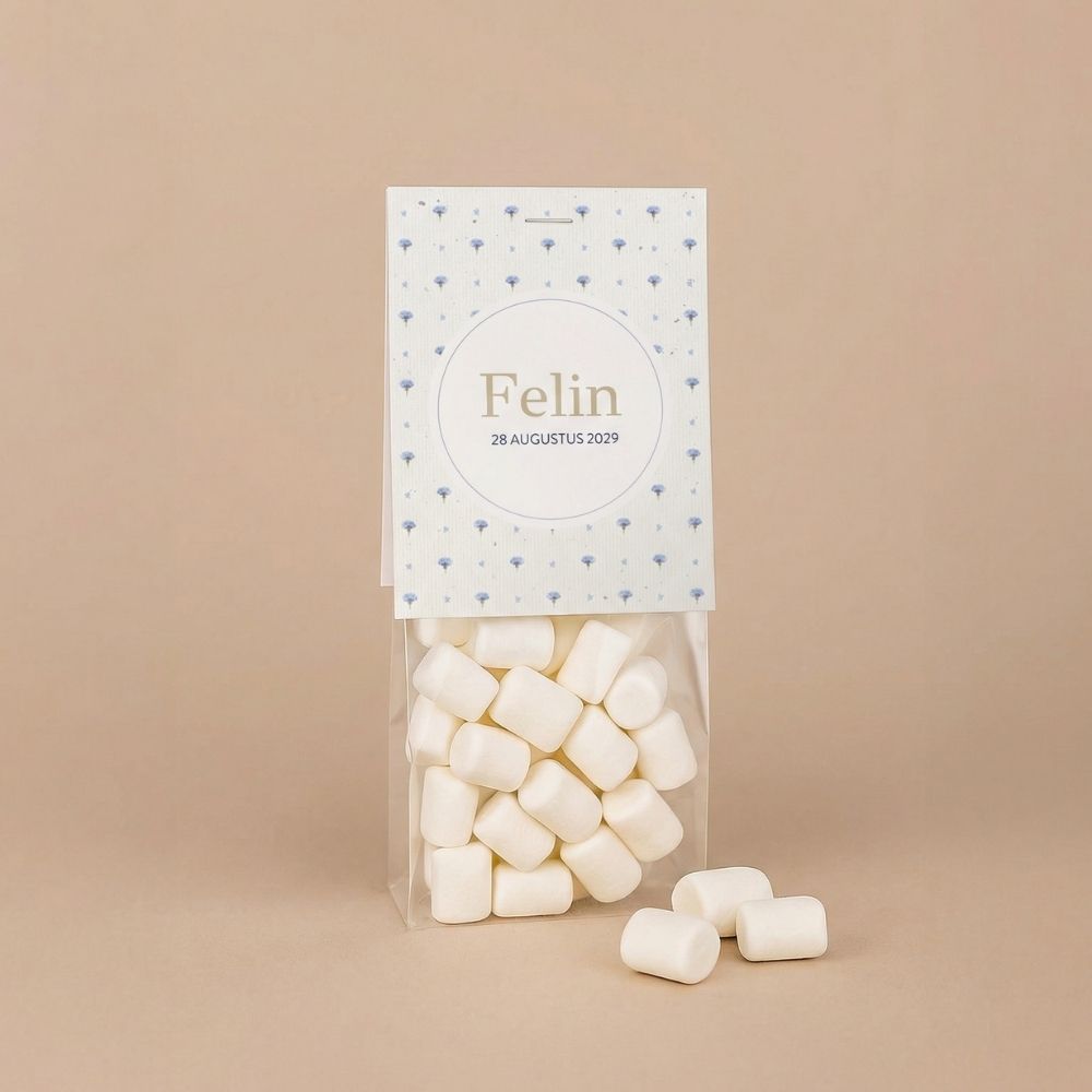 Dit vouwkaartje met bloemetjes patroon maakt van jouw doopsuikers een echt cadeautje. Bedank vrienden en familie in de stijl van je geboortekaartje voor alle lieve wensen en attenties. Bestel de transparante zakjes direct mee, zodat je het bedankje compleet kunt maken. Vul ze met snoepjes of doopsuikertjes, niet het kaartje vast en je hebt een prachtig geboortebedankje. Een heerlijk klusje om tijdens je verlof alvast te doen!