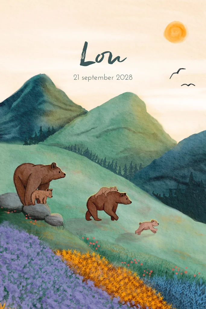 Vrolijk geboortekaartje uit de collectie Studio Dijs x Hannah Illustreert. Haal eenvoudig een beertje weg of voeg er 1 toe als je een familie hebt met meer of minder kindjes. De kaarten uit de collectie Studio Dijs x Hannah Illustreert worden gedrukt op duurzame papiersoorten.