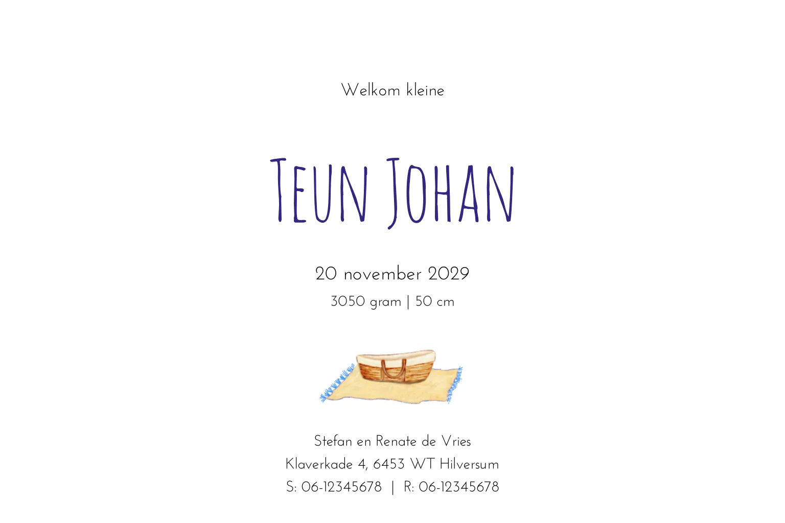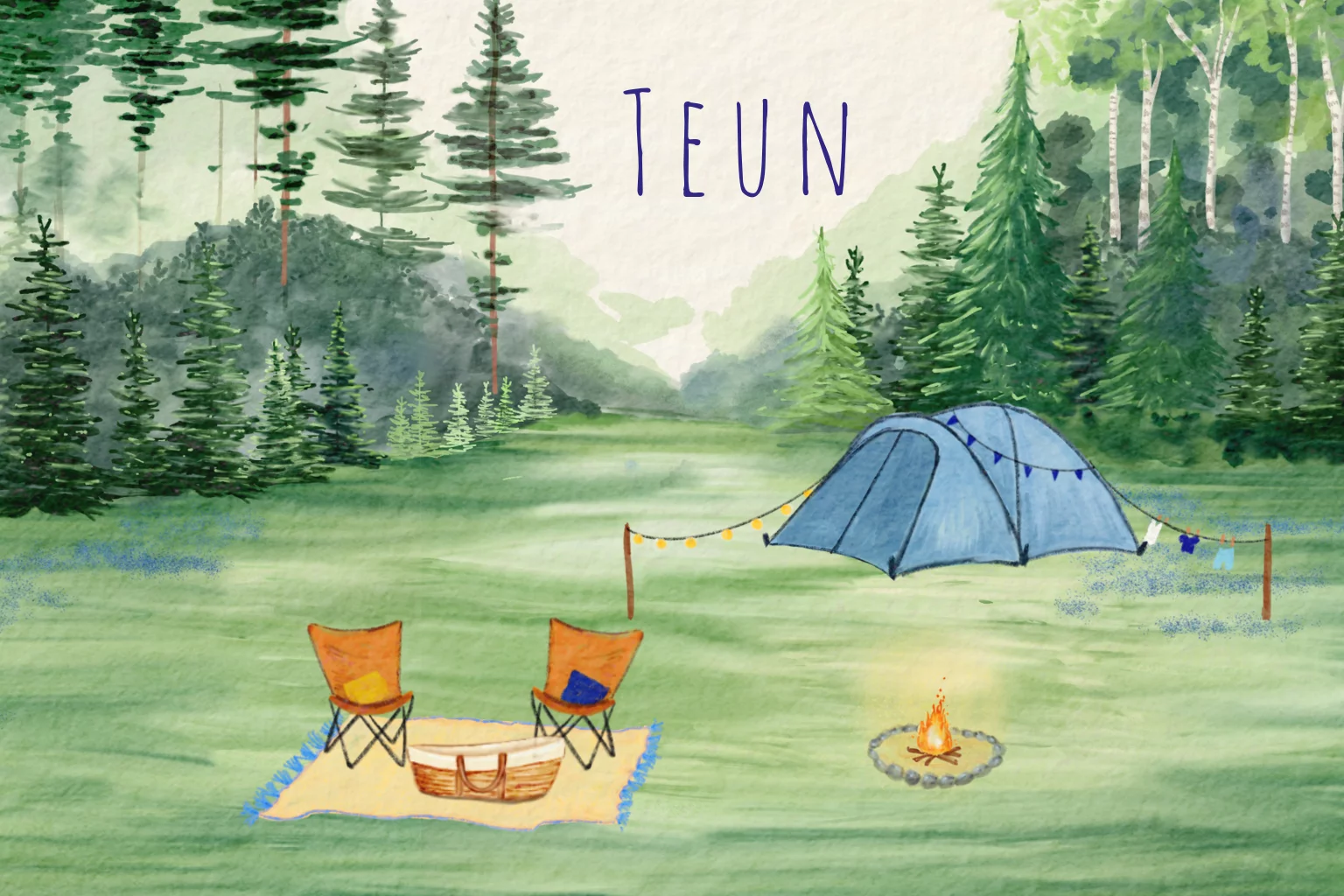 Avontuurlijk geboortekaartje voor een jongen met als thema 'kamperen'. Een tent met lampjes, waslijn met kleertjes eraan en een gezellig kampvuur. Het mozesmandje staat gezellig op een kleedje bij de campingstoelen van papa en mama.