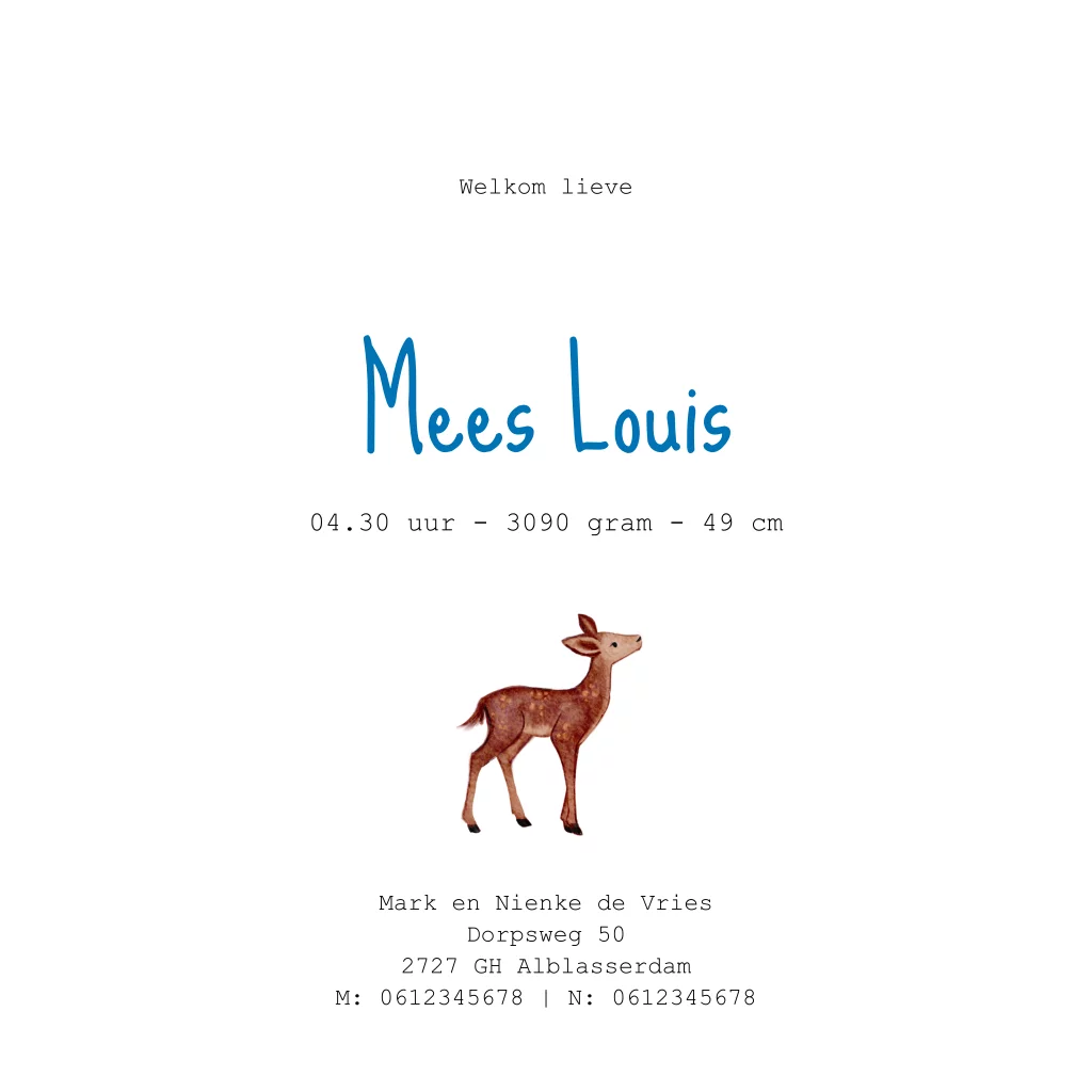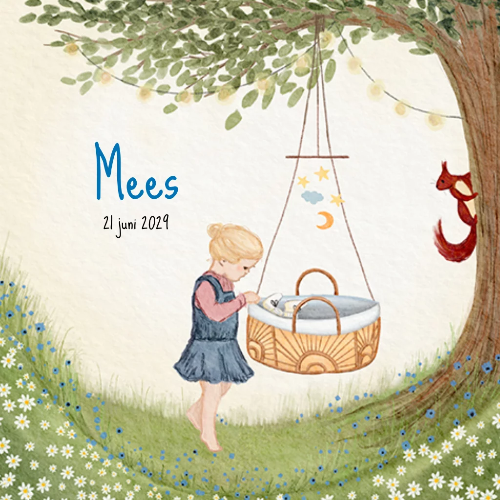 Geboortekaartje voor een jongen uit de collectie Studio Dijs X Hannah Illustreert. Een lieve illustratie met een grote zus kijkend in een mozesmandje. En een nieuwsgierige eekhoorn kijkt mee vanuit de boom. Dit kaartje is speciaal gemaakt voor de lente en zomer baby's.