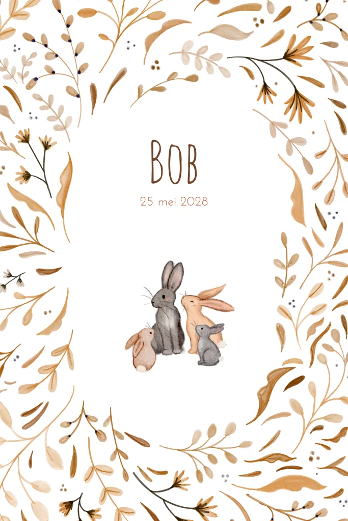 Unisex geboortekaartje met een konijnenfamilie. Pas het aantal konijntjes gemakkelijk zelf aan in de online editor. Een kaartje uit de collectie Studio Dijs x Hannah Illustreert.