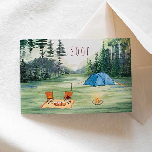 Avontuurlijk geboortekaartje voor een meisje met als thema 'kamperen'. Een tent met lampjes, waslijn met kleertjes eraan en een gezellig kampvuur. Het mozesmandje staat gezellig op een kleedje bij de campingstoelen van papa en mama.
