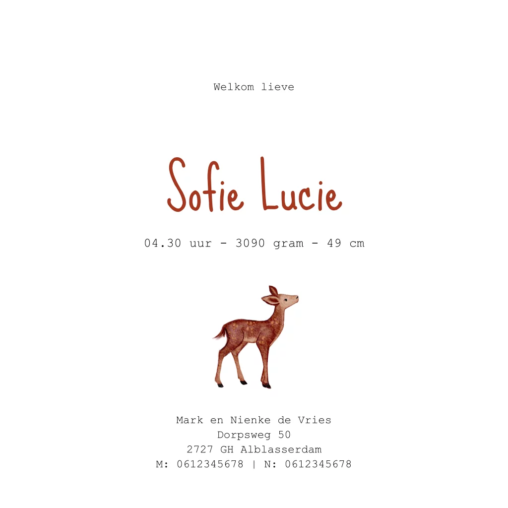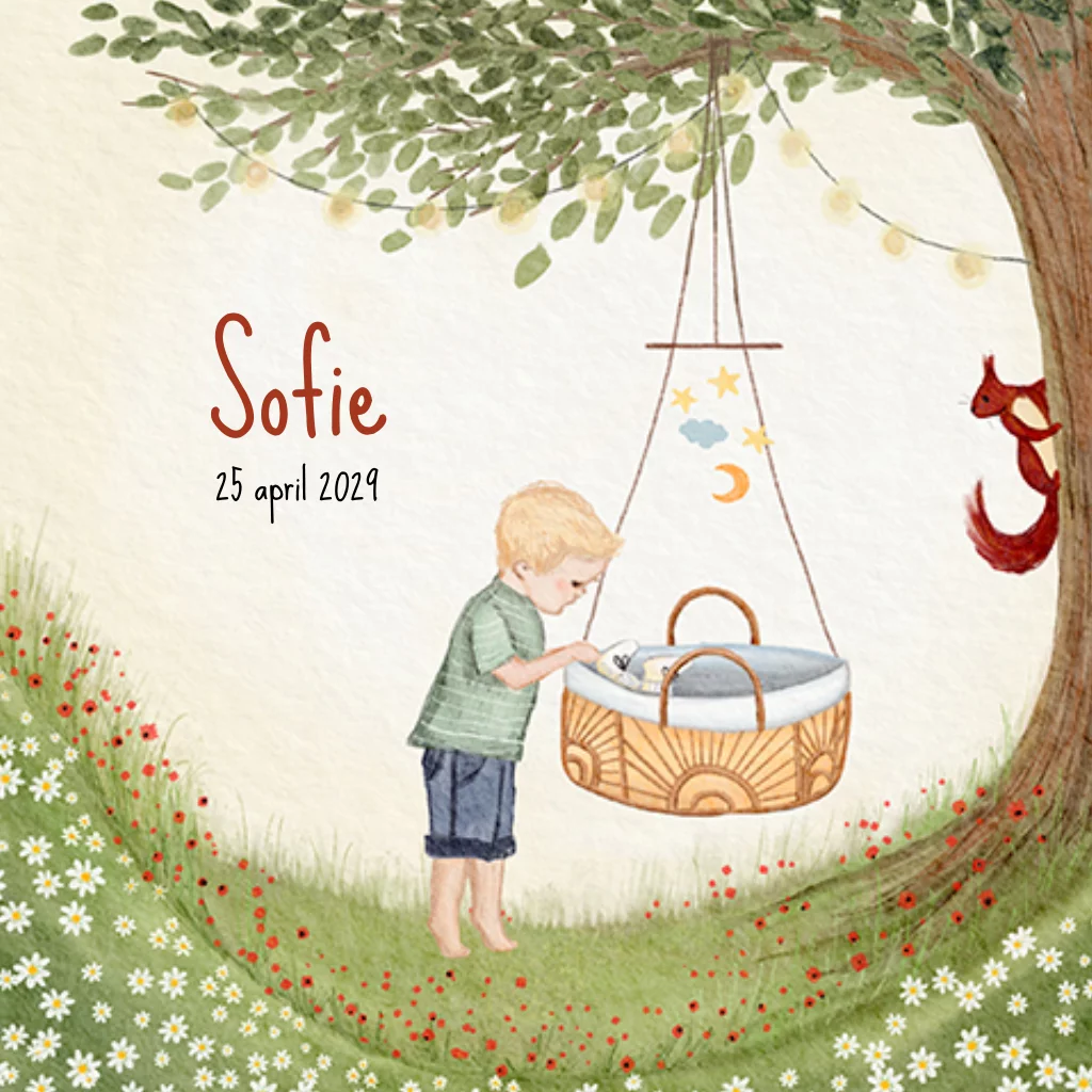 Geboortekaartje voor een meisje uit de collectie Studio Dijs X Hannah Illustreert. Een lieve illustratie van een grote broer kijkend in een mozesmandje. Een een nieuwsgierige eekhoorn kijkt mee vanuit de boom. Dit kaartje is speciaal gemaakt voor de lente en zomer baby's.