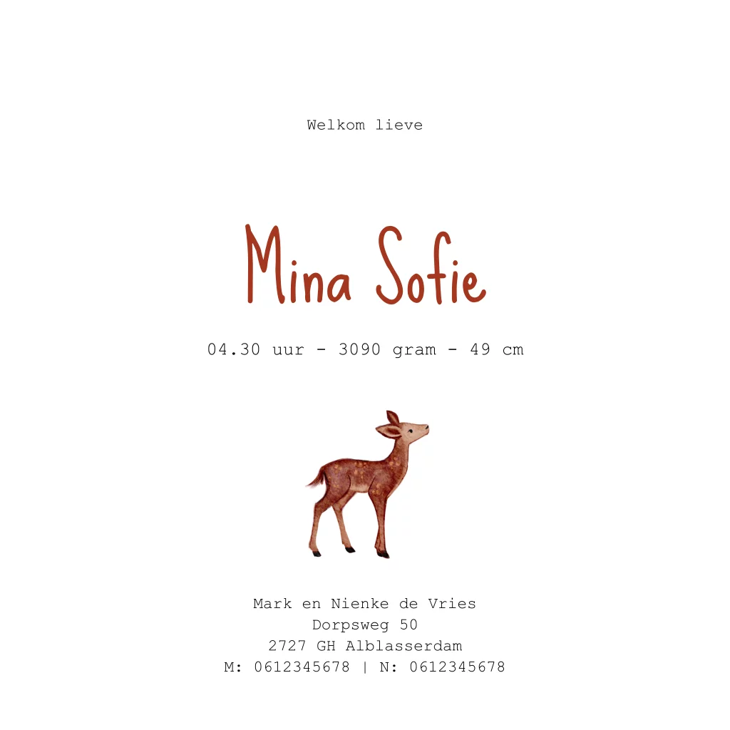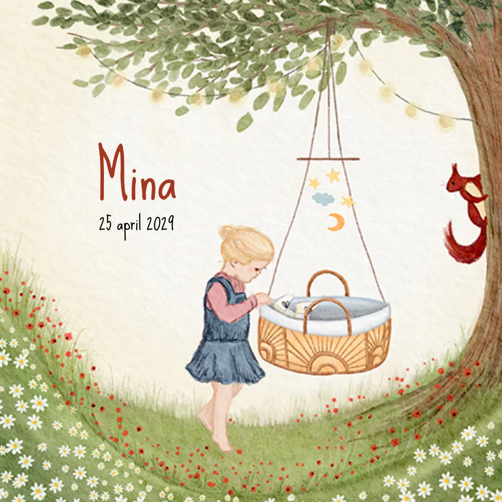 Geboortekaartje voor een meisje uit de collectie Studio Dijs X Hannah Illustreert. Een lieve illustratie van een grote zus kijkend in een mozesmandje. Een een nieuwsgierige eekhoorn kijkt mee vanuit de boom. Dit kaartje is speciaal gemaakt voor de lente en zomer baby's.