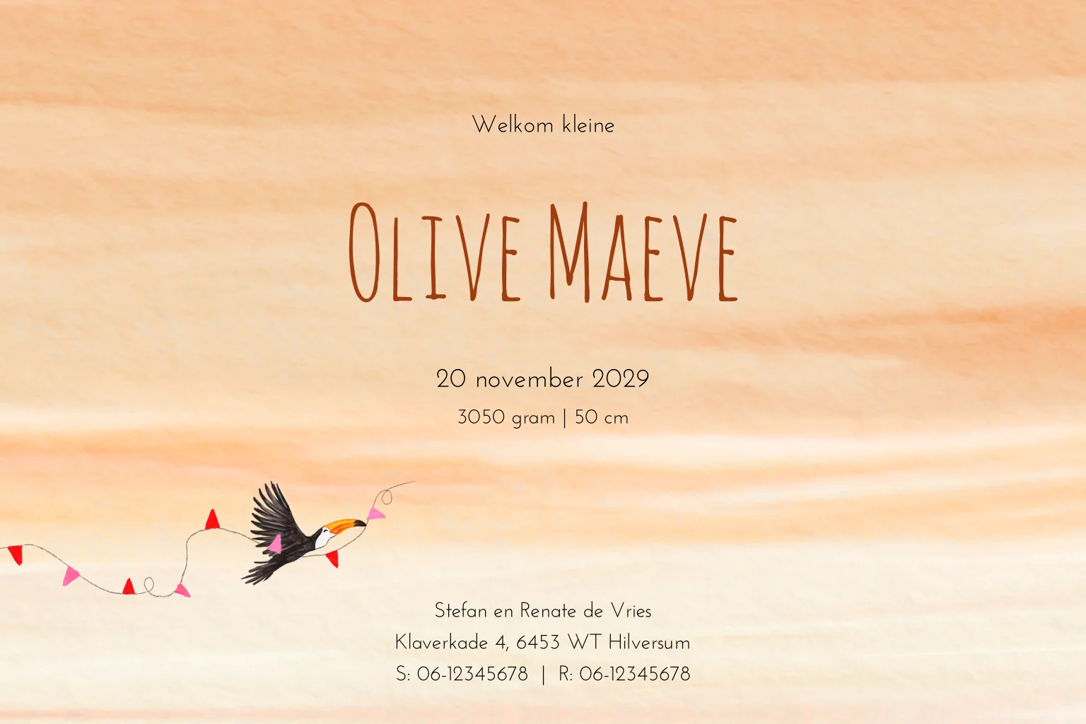 - Marloes“Ruime keuze uit geboortekaartjes die passen bij het seizoen, heel fijn dat je ze zelf kan aanpassen naar smaak. We hadden alles klaar staan en hoefde alleen nog geboorteinfo aan te passen. Daardoor waren de kaartjes al op dag 3 na de geboorte in huis! Superfijn.”