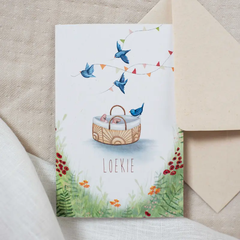 Prachtige illustratie uit de collectie Studio Dijs x Hannah Illustreert. Met lieve vogeltjes die met een feestelijke slinger de kleine verwelkomen. De kaarten uit de collectie Studio Dijs x Hannah Illustreert worden gedrukt op duurzame papiersoorten.