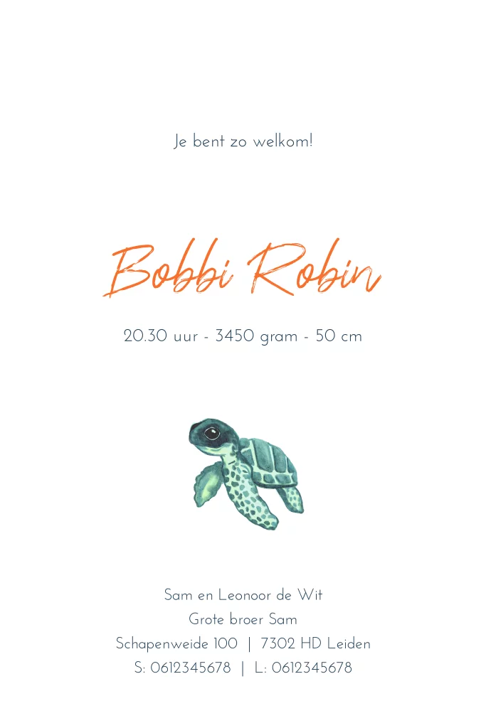 Prachtige illustratie van Studio Dijs x Hannah Illustreert. Met een baby schildpad en een schildpad broer of zus, zwemmend tussen de oranje visjes. De kaarten uit de collectie Studio Dijs x Hannah Illustreert worden gedrukt op duurzame papiersoorten. Kies jouw favoriet in het bestelproces!