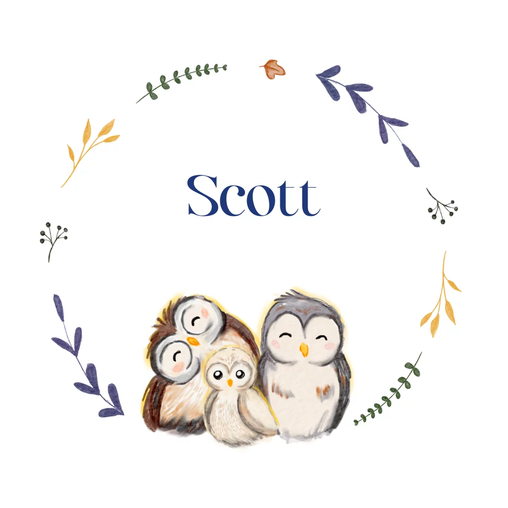 Geboortekaartje uit de collectie Studio Dijs x Hannah Illustreert. Met een vrolijke bladerkrans. En papa, mama en baby uil in een nestje.