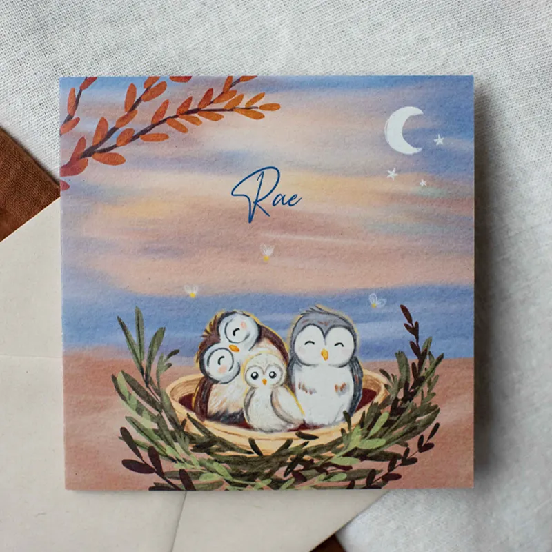 Geboortekaartje uit de collectie Studio Dijs x Hannah Illustreert. Met een kleurrijke lucht, en lieve uiltjes in een nestje.