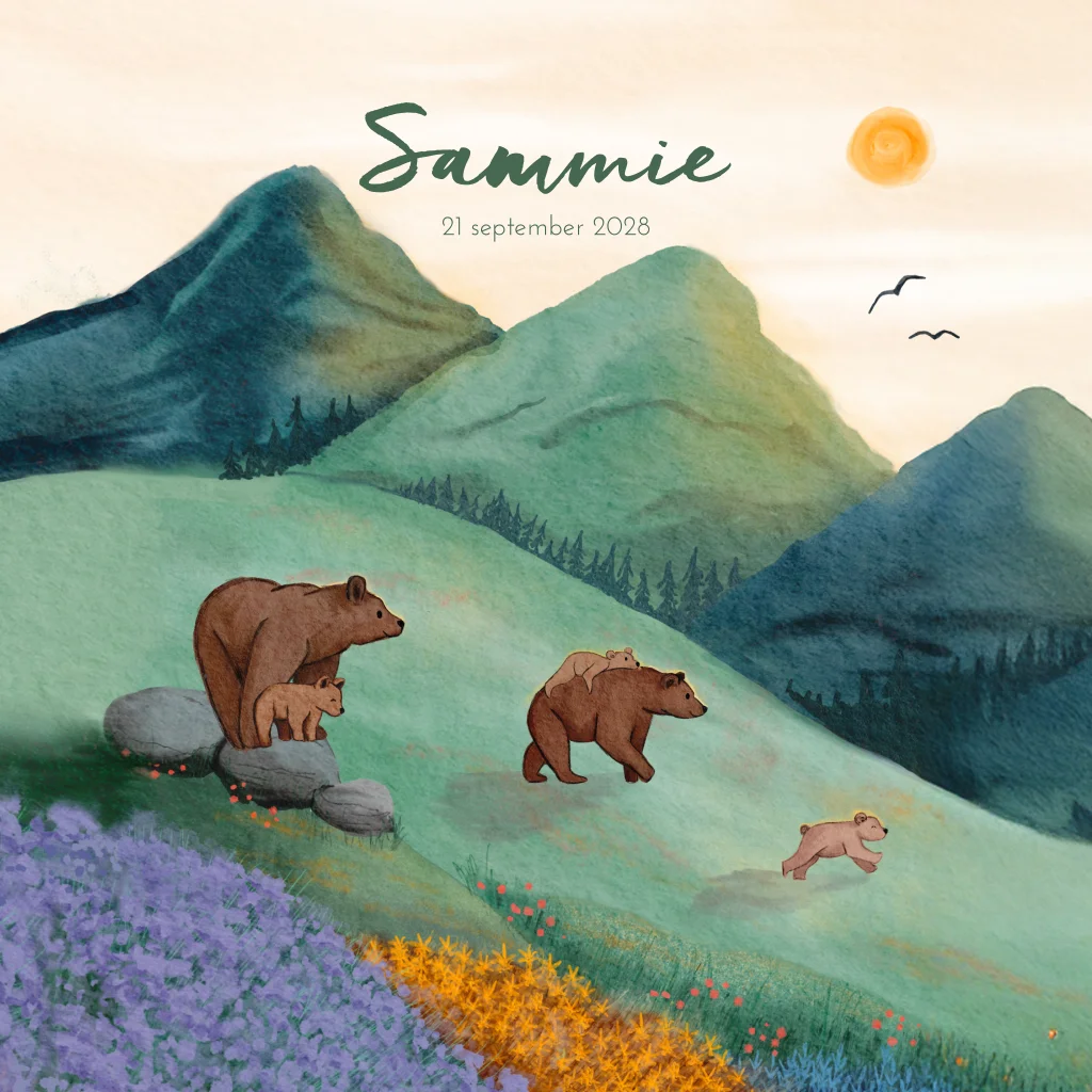 Geboortekaartje met familie beer in de bergen. Pas het aantal beertjes aan naar jouw eigen gezinsaantal in de online ontwerptool.