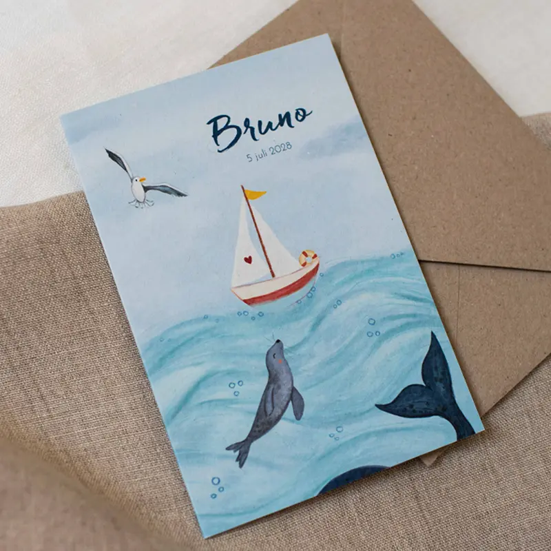 Geboortekaartje zeilboot zee meeuw zeehond walvis